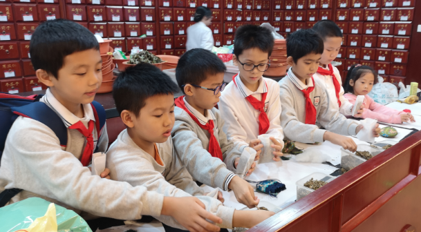在参观学习的过程中,小队成员不仅见识了古时候药店掌柜的工作场景、碾药工具和装药的容器,还亲身体验了一把“药店小掌柜”的角色,并且学习了中医九种体质的表现特征和辨识方法,近距离观摩了中医的传统治疗手段——针灸与推拿,在医生的指导下亲手制作了具有不同疗效的中药香囊。