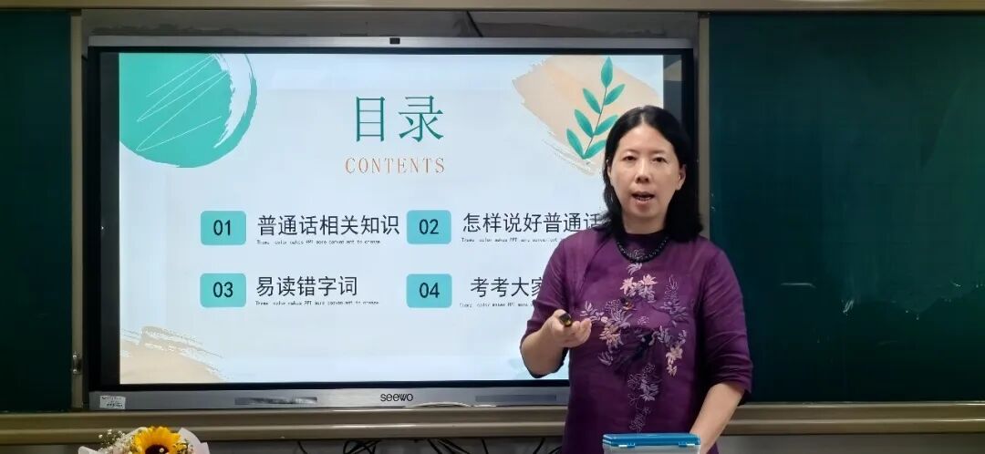 普通话是教师的职业语言,是从事教育、教学工作的基本功,掌握和使用普通话是每位教师必备的基本素质。作为国家级普通话水平测试员,我校校长仓红松为全体教师们带来了普通话专题培训。本着让教师们“多练习、多互动、多展示”的原则,仓红松校长通过“读易错字词”、“美文赏析”“问答互动”等环节,引导教师在表达中锻炼、在思考中感悟、在交流中共生智慧、在不断汲取中提升普通话专业水平。