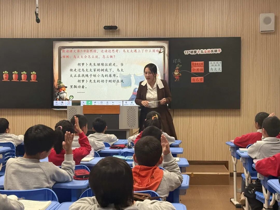 杨老师带领学生穿越知识的时空,遨游在“胡萝卜先生的长胡子”的奇幻故事里。在教学过程中,杨老师精准地把握住了文本特点,以预测为引导,通过提问的形式,鼓励学生思考和表达,使学生在整个教学活动中充分发挥主观能动性,让孩子们的想象力和创造力得到了充分地激发和展现。