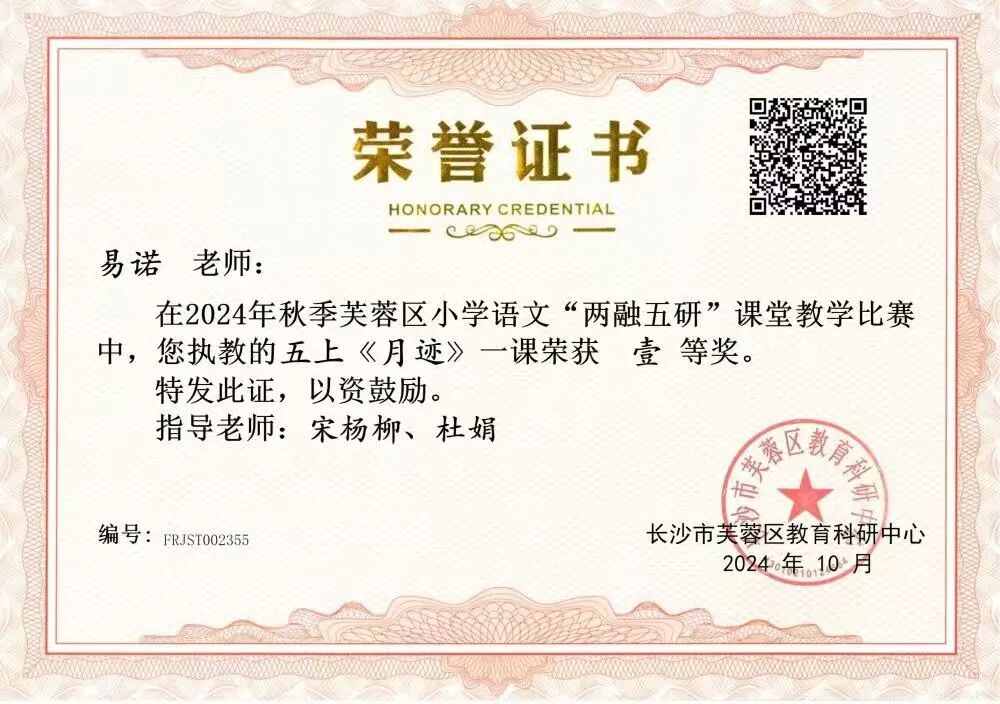 在2024年秋季芙蓉区小学语文“两融五研”教学评一致性课堂教学竞赛中,易诺老师获得区级一等奖。