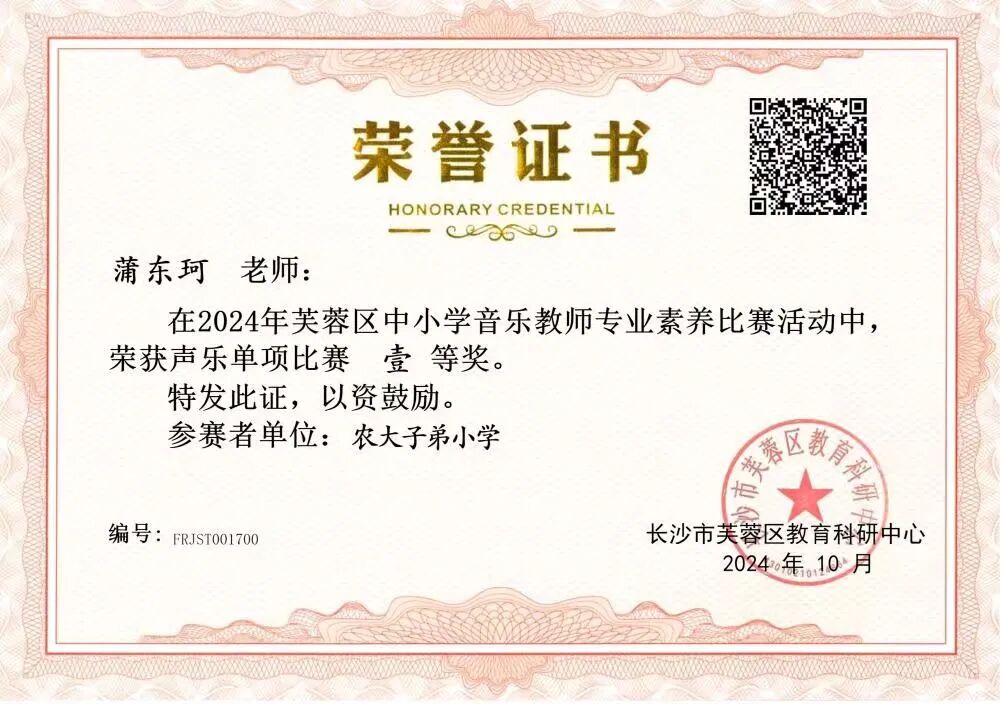 在2024年芙蓉区中小学音乐教师专业素养比赛活动中,蒲东珂老师凭借其卓越的声乐技艺与深厚的专业素养,荣获主专业(声乐)一等奖。